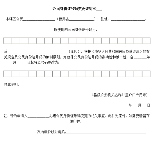 (4)如果身份证号变更,需提交如下格式的公民身份证号码变更证明,证明需盖县级公安机关户口专用章
