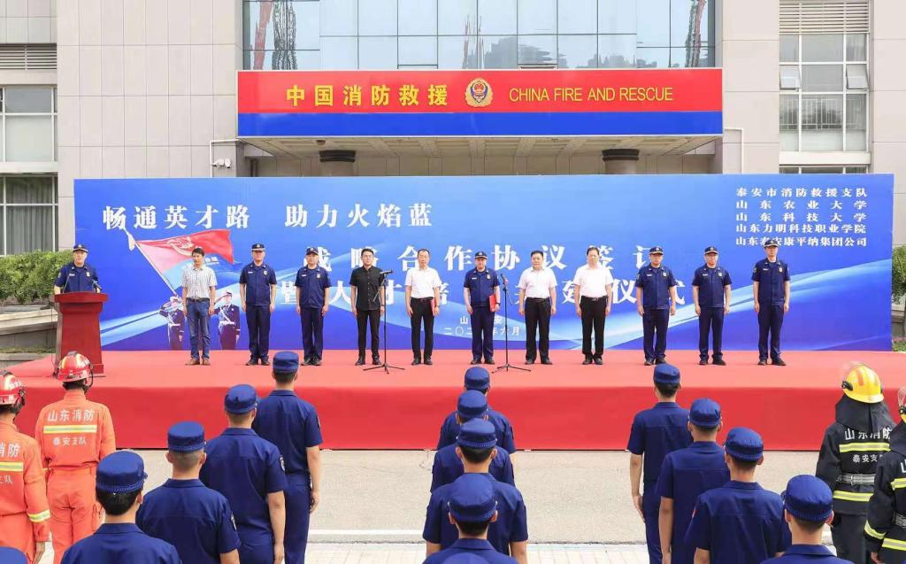 为进一步深化校地校企合作,充分发挥学校的人才优势和专业优势为经济社会发展服务,6月2日,受曾庆田副校长委托,beat365在线唯一官网直属党支部书记、院长王靖磊参加了泰安市消防救援支队、康平纳集团携手驻泰高校“畅通英才路•助力火焰蓝”战略合作协议签订暨人才培养共建仪式。