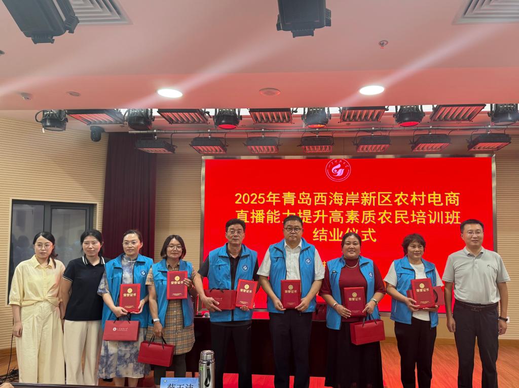 近日,由我校与青岛西海岸新区农业农村局联合举办的2025年青岛西海岸新区农村电商直播能力提升高素质农民培训班——暨青岛市高素质农民培育与学历提升衔接试点班顺利结业。此次培训班线下课程为期8天,吸引了来自西海岸新区各镇街的种植大户、农业合作社成员等40名学员参加,旨在提升农民电商直播专业水平,助力农产品拓宽销售渠道,推动乡村振兴。