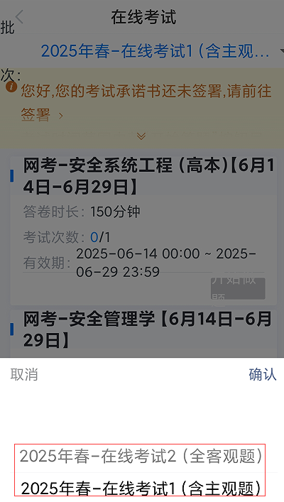 2.“2025年春-在线考试2(全客观题)”该批次为考查课类课程,均为客观题;